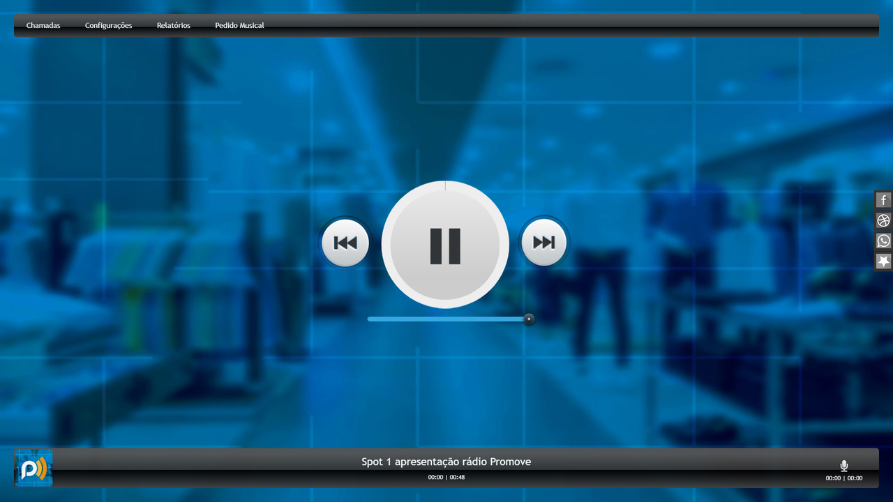 O microfone no lado direito da barra pausa a programação para você utilizar o microfone da loja (você anuncia ao vivo: oferta relâmpago, comunicado, sorteio...). Clicando novamente no microfone a programação volta de onde parou. Tempo máximo de 2 minutos para cada locução.