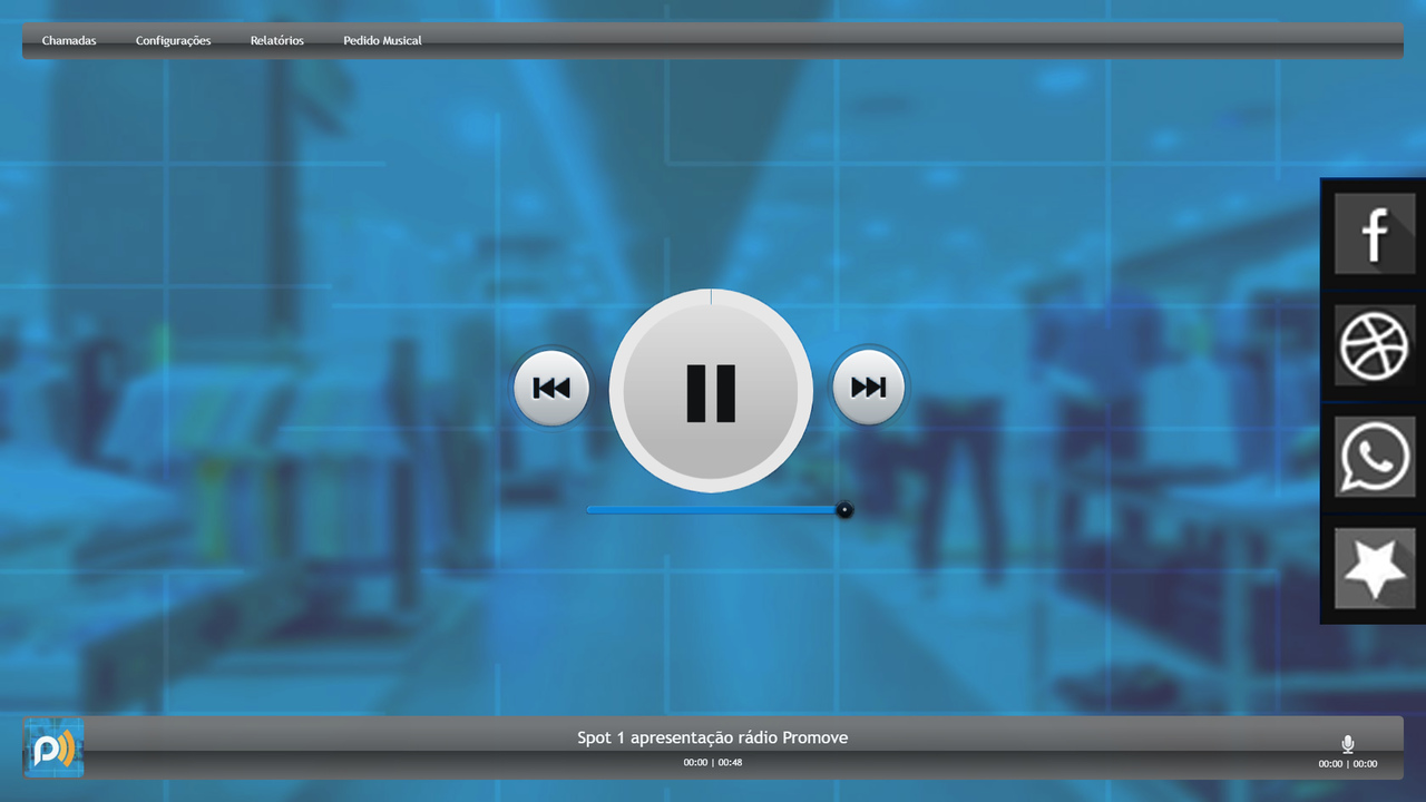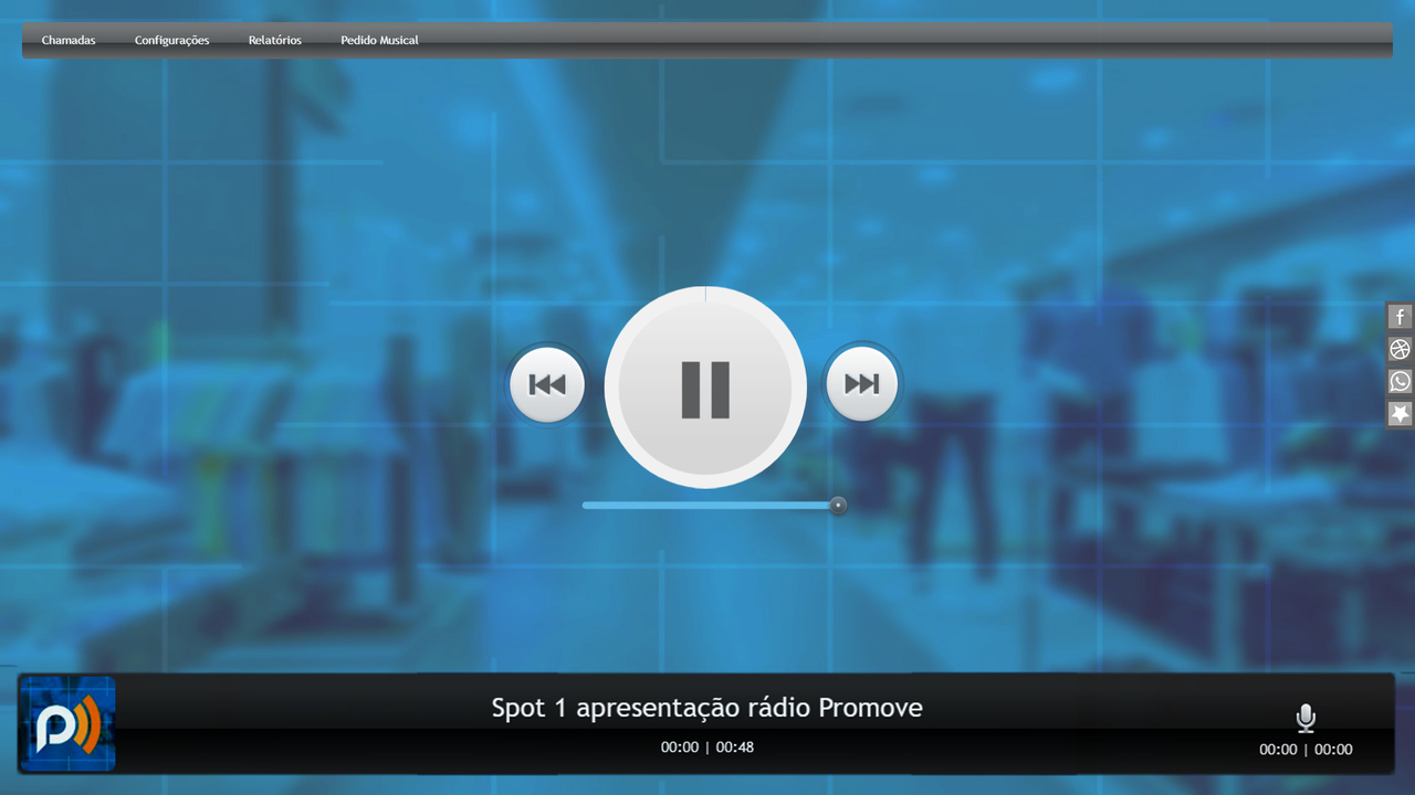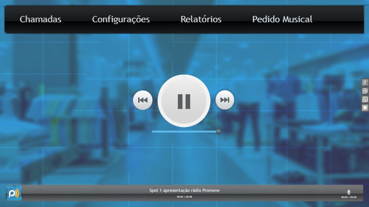 No menu superior você encontra os principais controles da sua rádio.Temos 4 funções disponíveis: chamadas, configurações, relatórios e pedido musical.