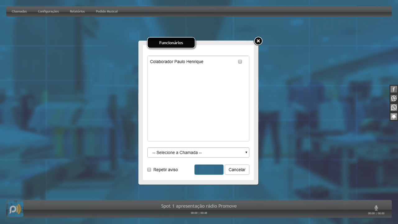 Ela solicita a presença do colaborador em qualquer setor da loja, sem causar transtorno. Você terá nesse espaço os nomes dos colaboradores e setores da loja com os áudios previamente gravados. Basta selecionar e chamar. Caso queira que a chamada seja feita duas vezes selecione repetir aviso antes de chamar. É rápido e fácil!